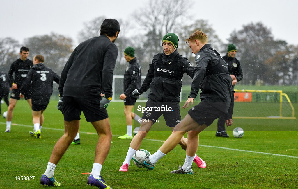11 November 2020; Danny Grant, centre, and Liam Scales during a Republic of Ireland U21 training session at the FAI National Training Centre in Abbotstown, Dublin. Photo by Seb Daly/Sportsfile