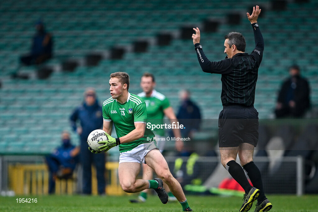 7 November 2020; Hugh Bourke of Limerick gets away from referee Maurice Deegan during the Munster GAA Football Senior Championship Semi-Final match between Limerick and Tipperary at LIT Gaelic Grounds in Limerick. Photo by Piaras Ó Mídheach/Sportsfile