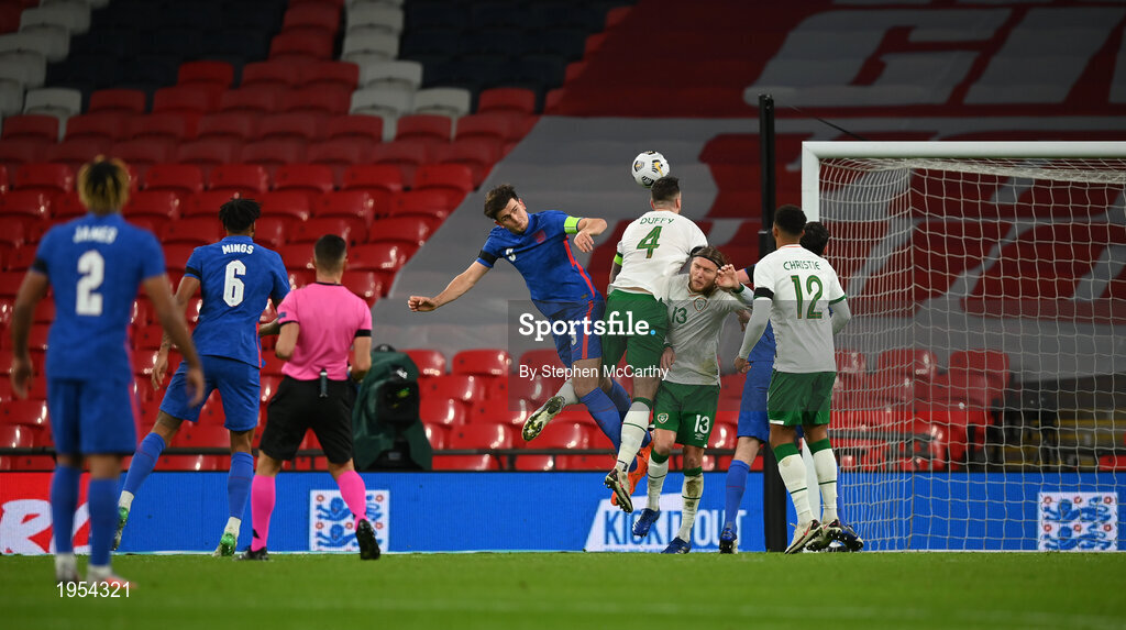 12 November 2020; Harry Maguire of England heads to score his side's first goal despite the attempts of Shane Duffy of Republic of Ireland during the International Friendly match between England and Republic of Ireland at Wembley Stadium in London, England. Photo by Stephen McCarthy/Sportsfile