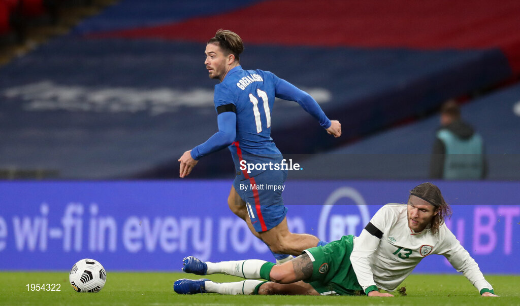 12 November 2020; Jack Grealish of England gets away from Jeff Hendrick of Republic of Ireland during the International Friendly match between England and Republic of Ireland at Wembley Stadium in London, England. Photo by Matt Impey/Sportsfile