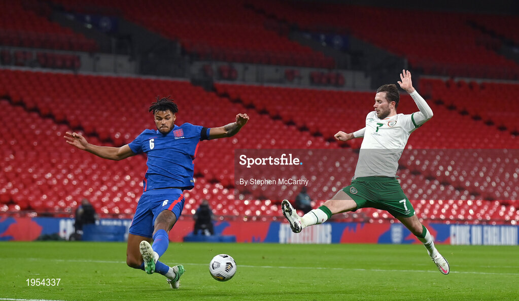 12 November 2020; Tyrone Mings of England in action against Alan Browne of Republic of Ireland during the International Friendly match between England and Republic of Ireland at Wembley Stadium in London, England. Photo by Stephen McCarthy/Sportsfile