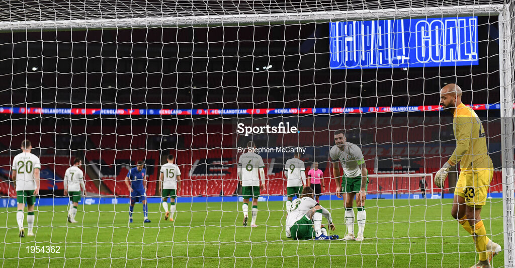 12 November 2020; Shane Duffy, left, and Darren Randolph of Republic of Ireland react after their side conceded their first goal goal during the International Friendly match between England and Republic of Ireland at Wembley Stadium in London, England. Photo by Stephen McCarthy/Sportsfile