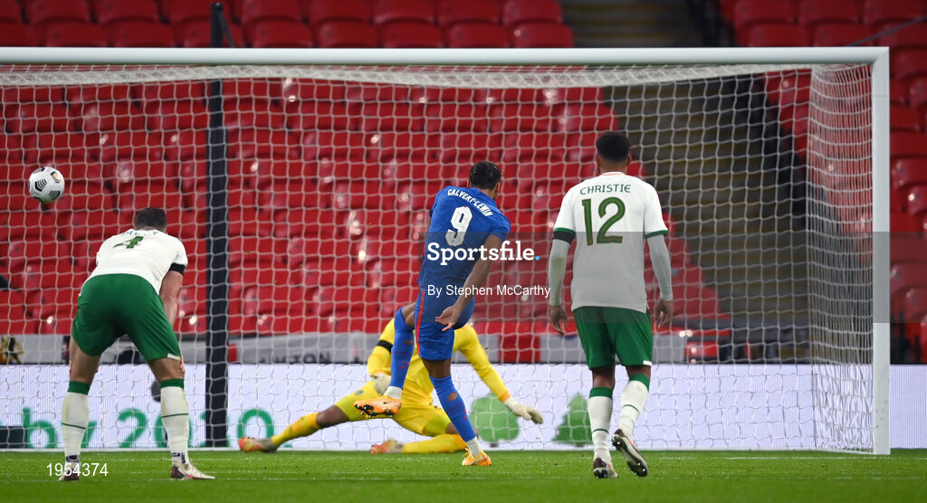 12 November 2020; Dominic Calvert-Lewin of England shoots to score his side's third goal, from a penalty, past Darren Randolph of Republic of Ireland during the International Friendly match between England and Republic of Ireland at Wembley Stadium in London, England. Photo by Stephen McCarthy/Sportsfile