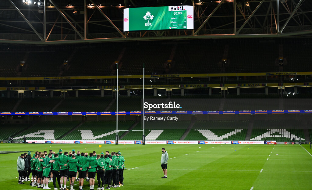 13 November 2020; The Ireland team huddle ahead of the Autumn Nations Cup match between Ireland and Wales at Aviva Stadium in Dublin. Photo by Ramsey Cardy/Sportsfile