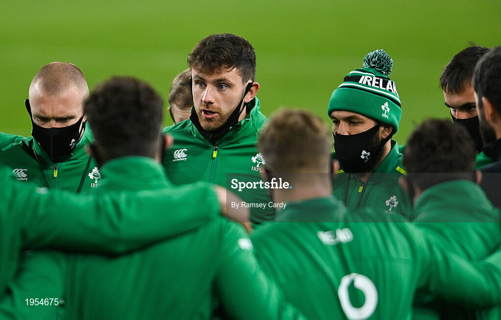 13 November 2020; Hugo Keenan of Ireland speaks in the Ireland huddle ahead of the Autumn Nations Cup match between Ireland and Wales at Aviva Stadium in Dublin. Photo by Ramsey Cardy/Sportsfile
