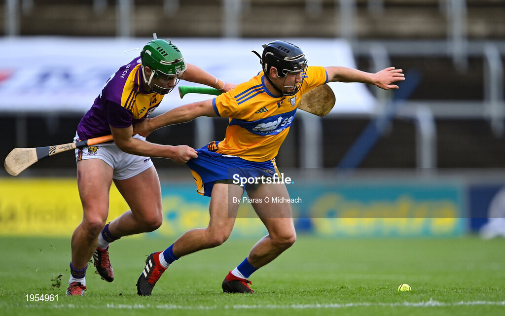14 November 2020; David Reidy of Clare is tackled by Conor McDonald of Wexford during the GAA Hurling All-Ireland Senior Championship Qualifier Round 2 match between Wexford and Clare at MW Hire O'Moore Park in Portlaoise, Laois. Photo by Piaras Ó Mídheach/Sportsfile