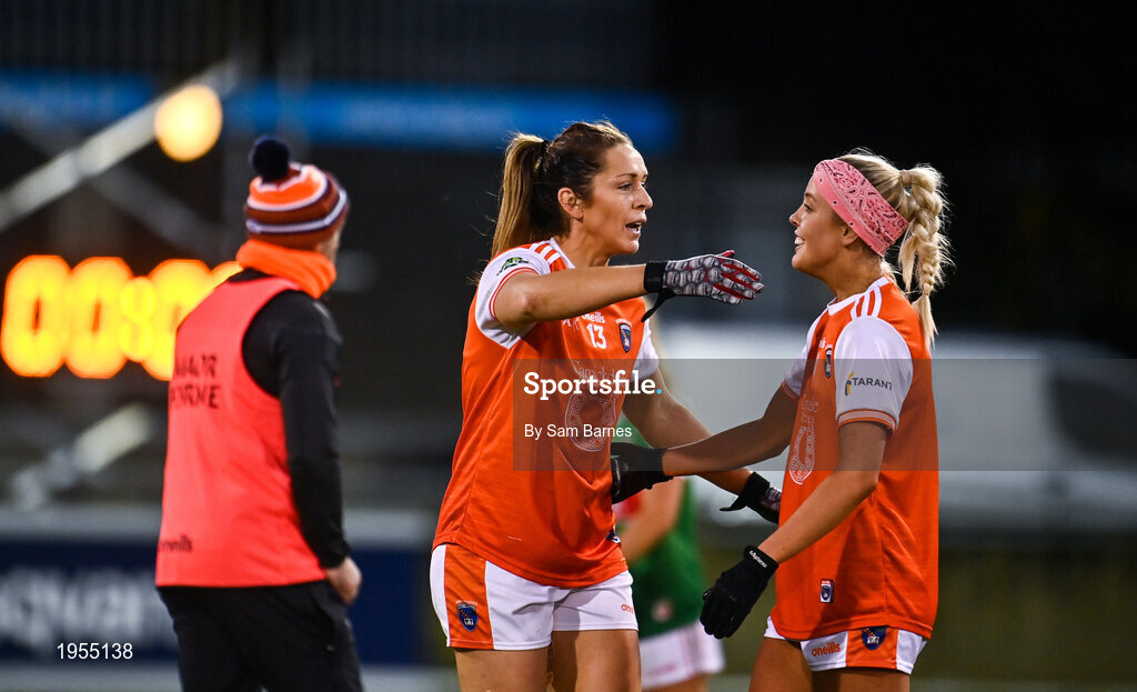 14 November 2020; Caroline O'Hanlon, left, and Niamh Coleman of Armagh embrace following their sides victory in the TG4 All-Ireland Senior Ladies Football Championship Round 3 match between Armagh and Mayo at Parnell Park in Dublin. Photo by Sam Barnes/Sportsfile