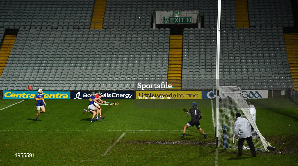 14 November 2020; Séamus Harnedy of Cork scores a point despite the best efforts of Cathal Barrett of Tipperary in front on an empty stand during the GAA Hurling All-Ireland Senior Championship Qualifier Round 2 match between Cork and Tipperary at LIT Gaelic Grounds in Limerick. Photo by Brendan Moran/Sportsfile