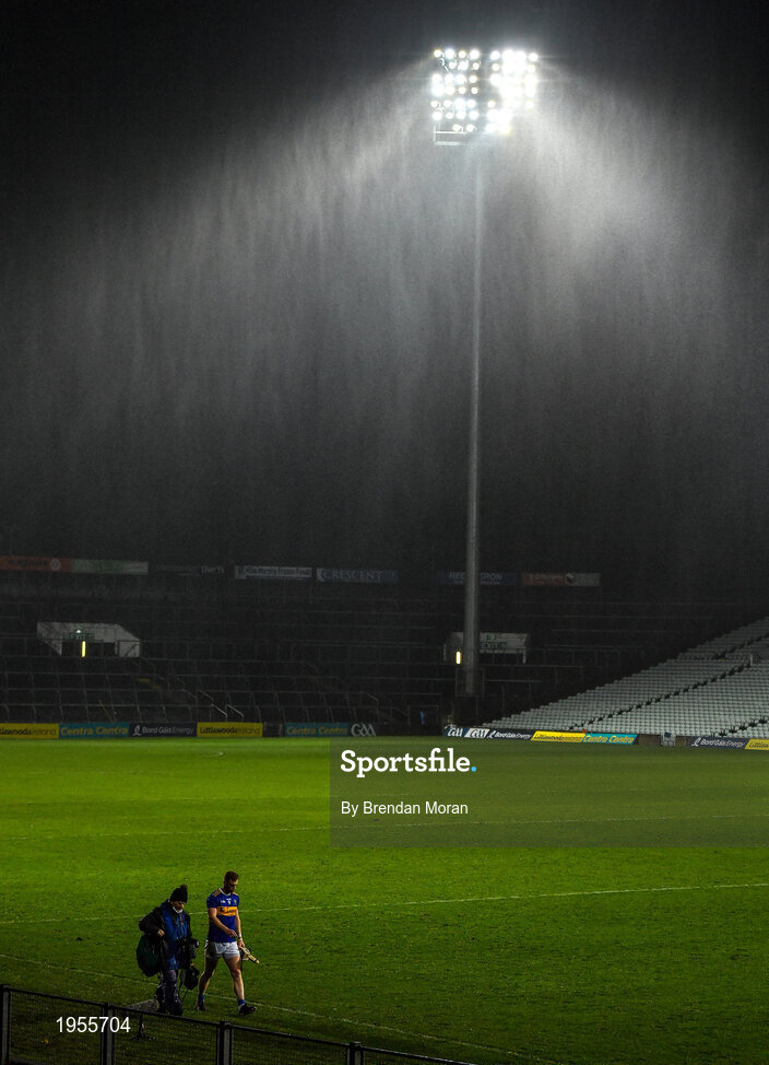 14 November 2020; Michael Breen of Tipperary leaves the pitch amid heavy rain, accompanied by local Tipperary photographer Bridget Delaney, after the GAA Hurling All-Ireland Senior Championship Qualifier Round 2 match between Cork and Tipperary at LIT Gaelic Grounds in Limerick. Photo by Brendan Moran/Sportsfile
