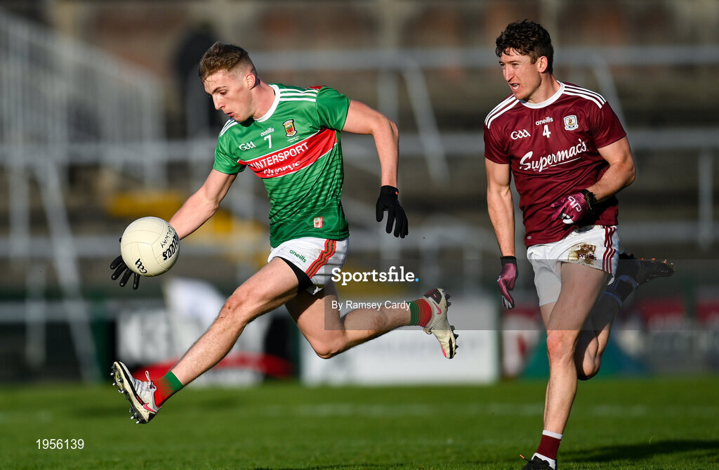 15 November 2020; Eoghan McLaughlin of Mayo in action against Johnny Heaney of Galway during the Connacht GAA Football Senior Championship Final match between Galway and Mayo at Pearse Stadium in Galway. Photo by Ramsey Cardy/Sportsfile
