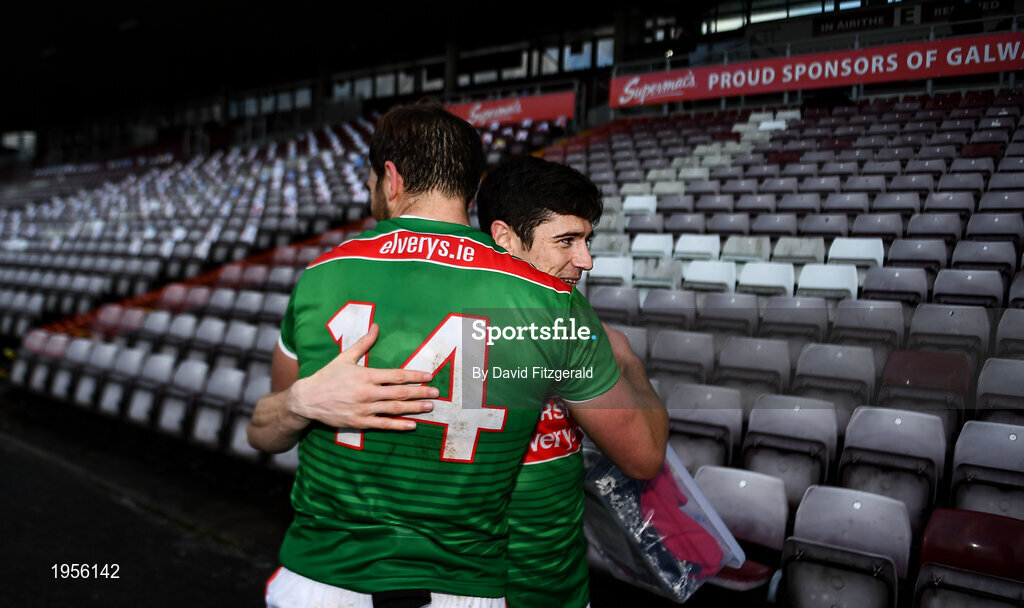 15 November 2020; Aidan O'Shea of Mayo, left, and Conor Loftus embrace after the Connacht GAA Football Senior Championship Final match between Galway and Mayo at Pearse Stadium in Galway. Photo by David Fitzgerald/Sportsfile