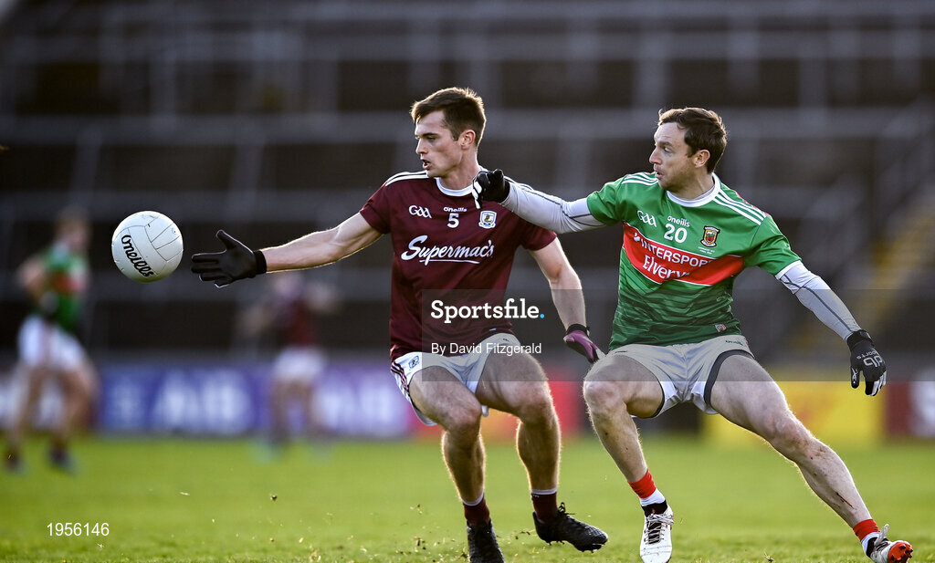 15 November 2020; Liam Silke of Galway in action against Keith Higgins of Mayo during the Connacht GAA Football Senior Championship Final match between Galway and Mayo at Pearse Stadium in Galway. Photo by David Fitzgerald/Sportsfile