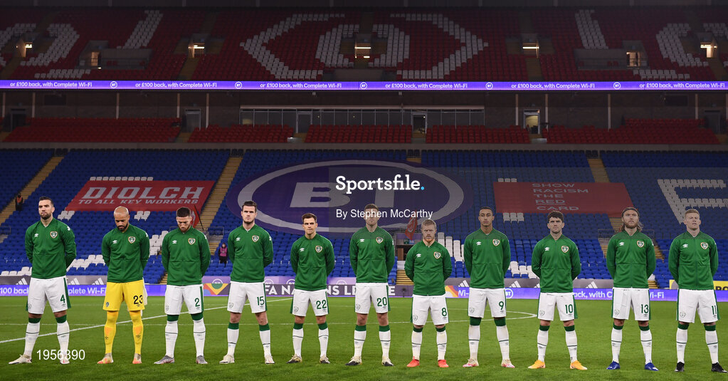 15 November 2020; The Republic of Ireland team prior to the UEFA Nations League B match between Wales and Republic of Ireland at Cardiff City Stadium in Cardiff, Wales. Photo by Stephen McCarthy/Sportsfile