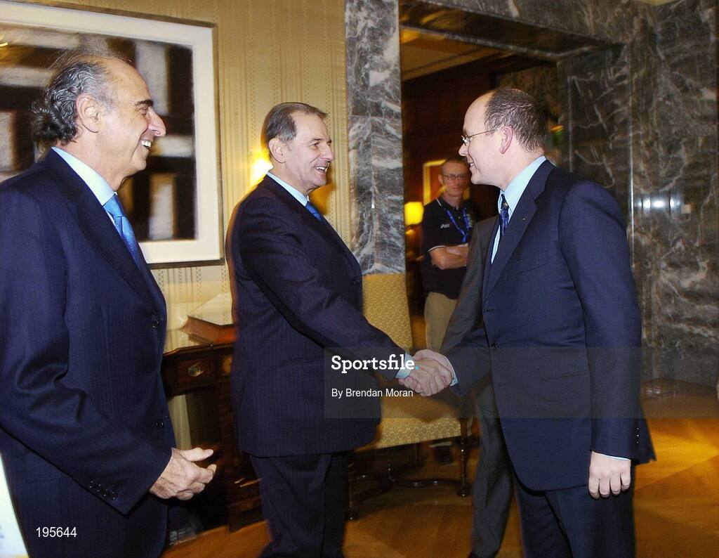 2 December 2005; HSH Prince Albert II of Monaco is greeted by Dr Jacques Rogge, President, International Olympic Committee, in the company of Mario Pescante, left, President, European Olympic Committee, at the European Olympic Committee General Assembly. Four Season's Hotel, Dublin. Picture credit: Brendan Moran / SPORTSFILE