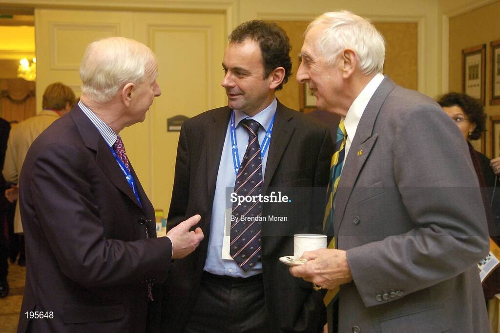 2 December 2005; Pat Hickey, President of the Olympic Council of Ireland, in conversation with Stephen Martin, centre, new incoming CEO of the Olympic Council of Ireland, and Irish Gold Medallist at the 1956 Olympic Games, Ronnie Delany, right, at the European Olympic Committee General Assembly. Four Season's Hotel, Dublin. Picture credit: Brendan Moran / SPORTSFILE