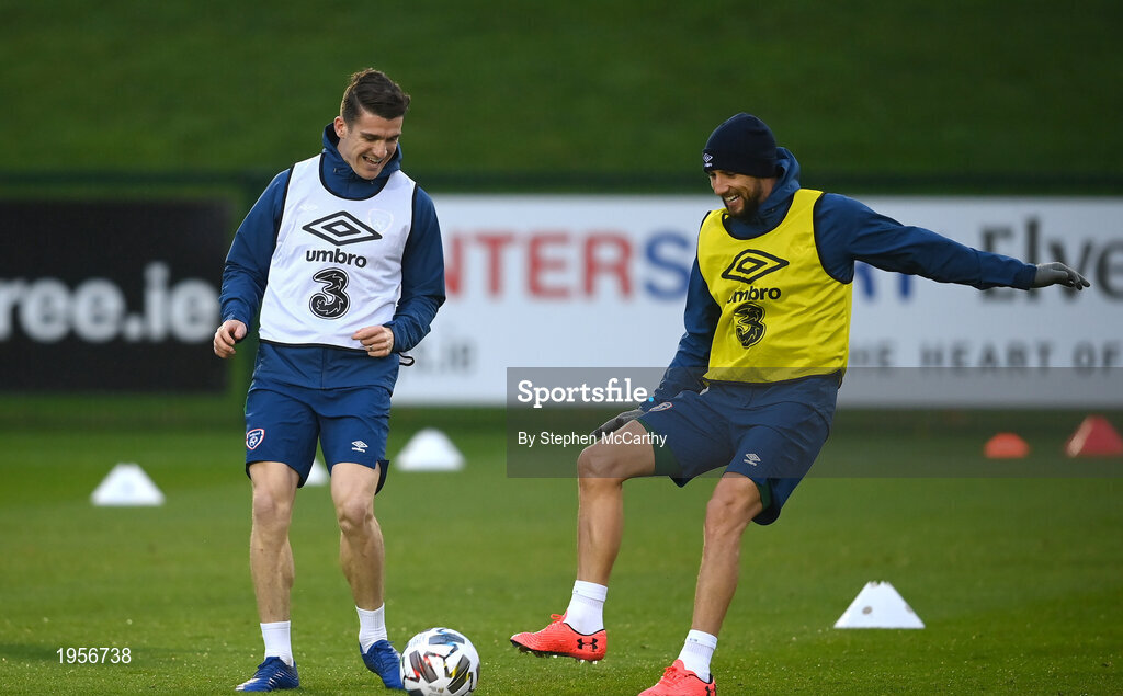 16 November 2020; Darragh Lenihan, left, and Conor Hourihane during a Republic of Ireland training session at FAI National Training Centre in Abbotstown, Dublin. Photo by Stephen McCarthy/Sportsfile
