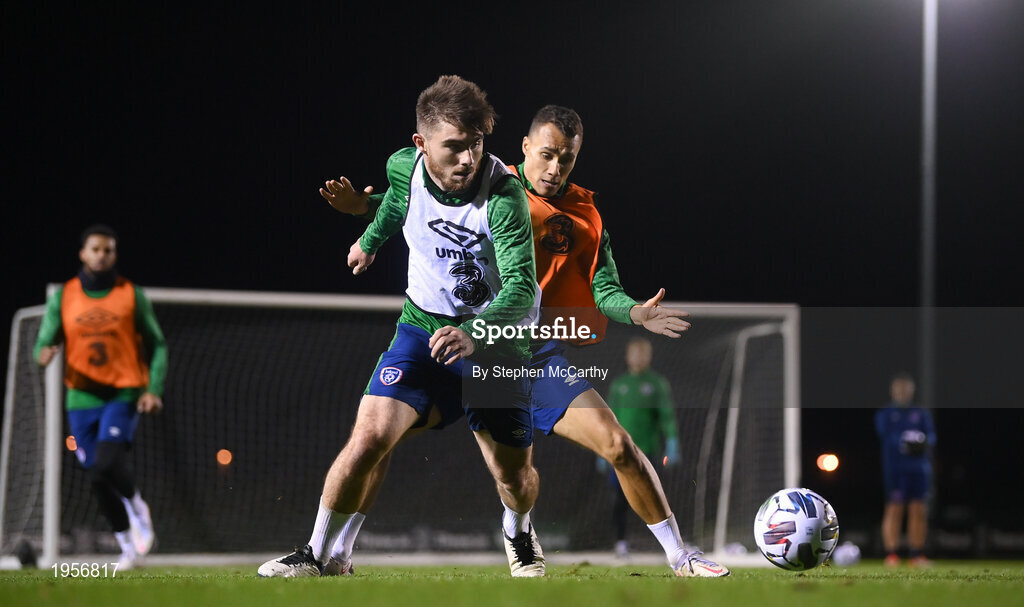16 November 2020; Ryan Manning and Graham Burke, right, during a Republic of Ireland training session at the FAI National Training Centre in Abbotstown, Dublin. Photo by Stephen McCarthy/Sportsfile