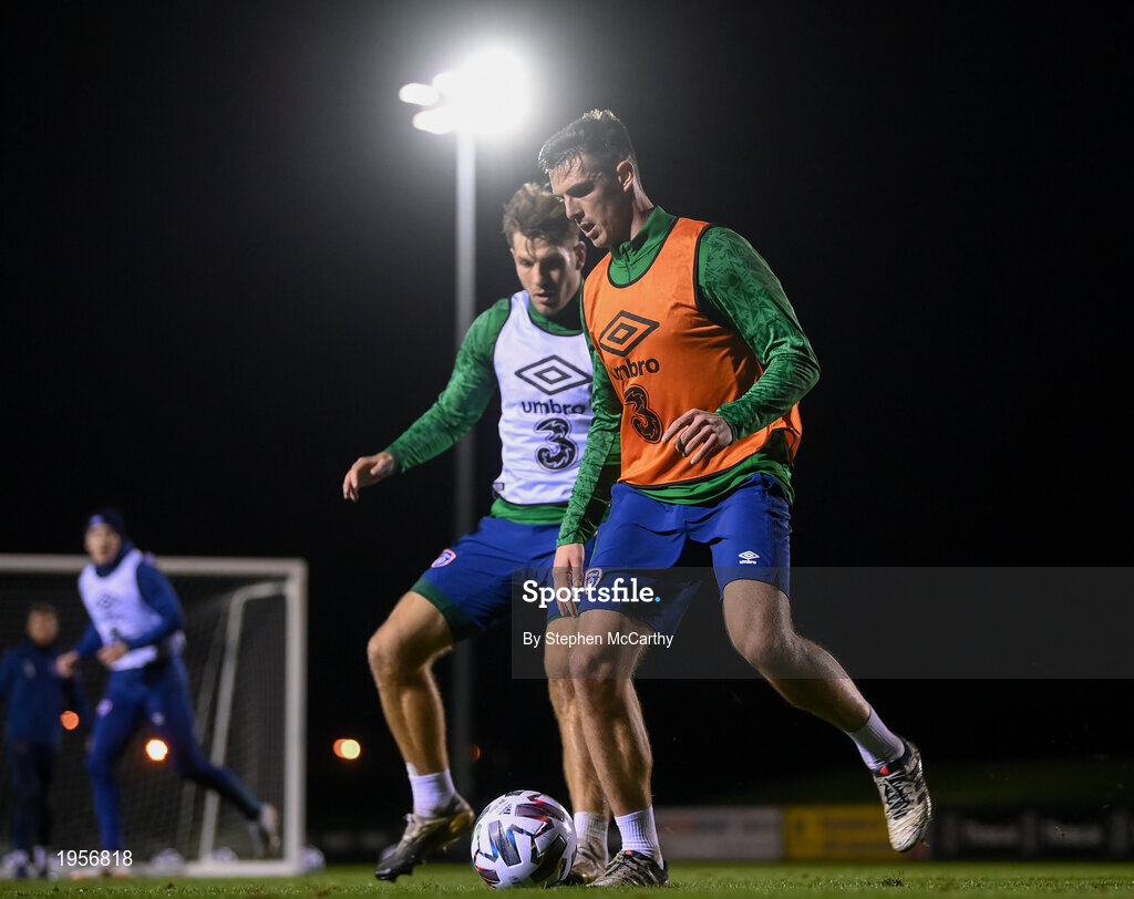 16 November 2020; Ciaran Clark, right, and James Collins during a Republic of Ireland training session at the FAI National Training Centre in Abbotstown, Dublin. Photo by Stephen McCarthy/Sportsfile
