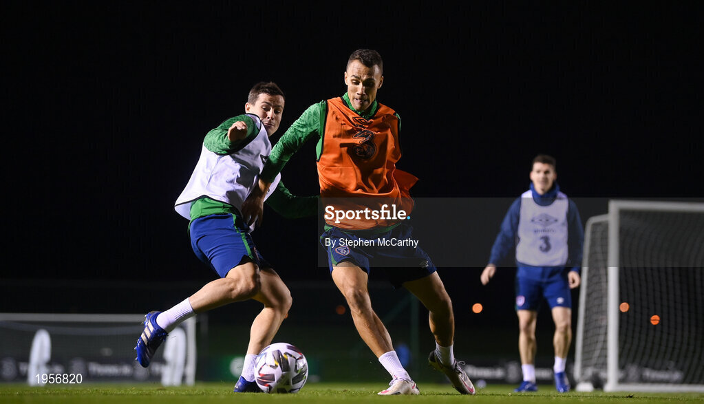 16 November 2020; Graham Burke and Josh Cullen, left, during a Republic of Ireland training session at the FAI National Training Centre in Abbotstown, Dublin. Photo by Stephen McCarthy/Sportsfile