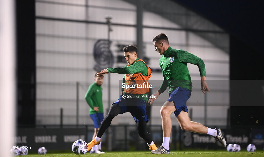 16 November 2020; Callum O’Dowda and Ciaran Clark, right, during a Republic of Ireland training session at the FAI National Training Centre in Abbotstown, Dublin. Photo by Stephen McCarthy/Sportsfile
