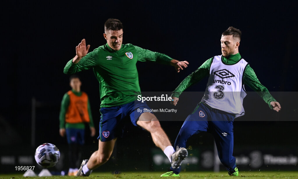 16 November 2020; Jack Byrne, right, and Ciaran Clark during a Republic of Ireland training session at the FAI National Training Centre in Abbotstown, Dublin. Photo by Stephen McCarthy/Sportsfile