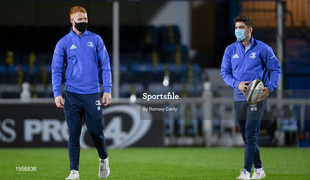 16 November 2020; Ciarán Frawley, left, and Jimmy O'Brien of Leinster ahead of the Guinness PRO14 match between Leinster and Edinburgh at RDS Arena in Dublin. Photo by Ramsey Cardy/Sportsfile
