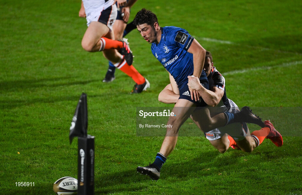 16 November 2020; Jimmy O'Brien of Leinster is tackled by Mark Bennett of Edinburgh during the Guinness PRO14 match between Leinster and Edinburgh at RDS Arena in Dublin. Photo by Ramsey Cardy/Sportsfile