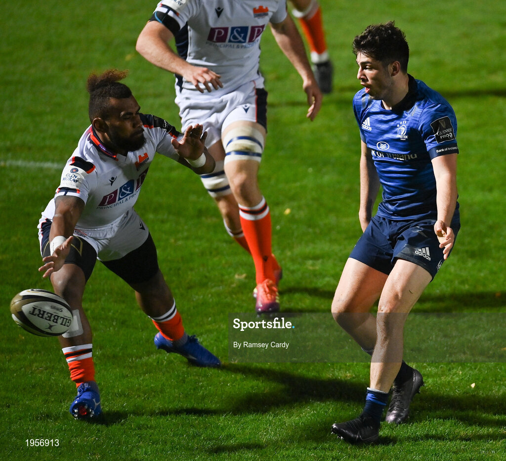 16 November 2020; Jimmy O'Brien of Leinster kicks past Eroni Sau of Edinburgh to set up his side's first try during the Guinness PRO14 match between Leinster and Edinburgh at RDS Arena in Dublin. Photo by Ramsey Cardy/Sportsfile