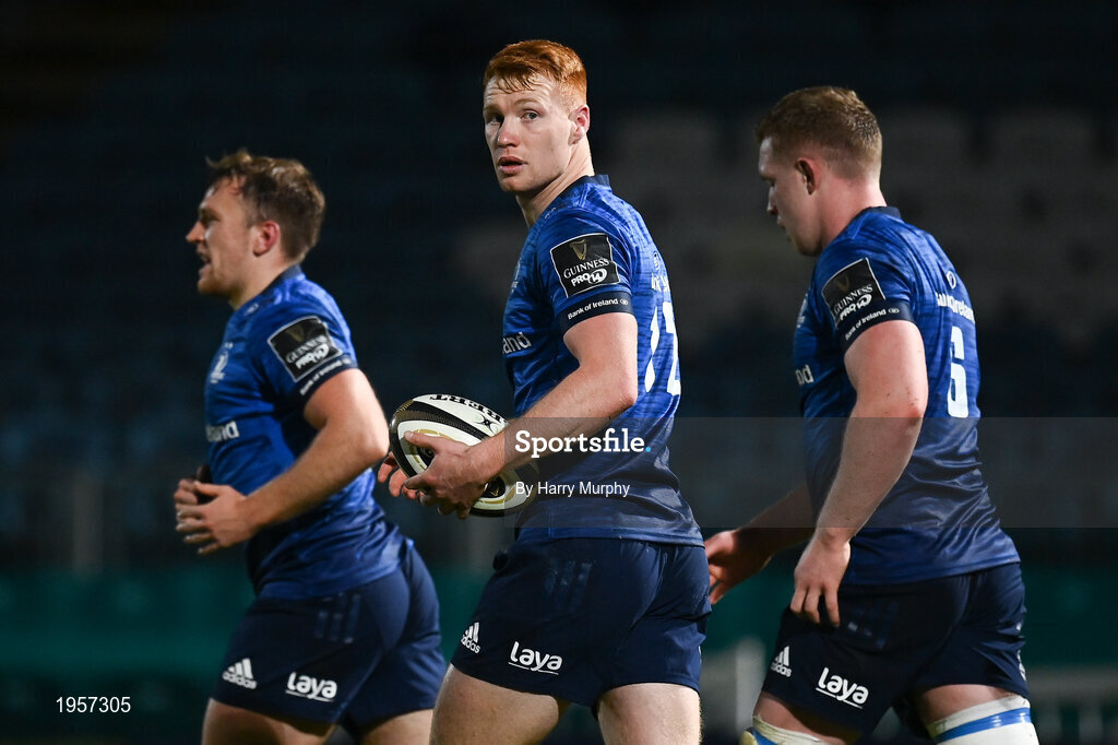 16 November 2020; Ciarán Frawley of Leinster, centre, Liam Turner and Dan Leavy during the Guinness PRO14 match between Leinster and Edinburgh at the RDS Arena in Dublin. Photo by Harry Murphy/Sportsfile