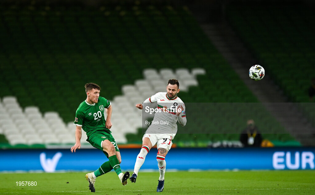 18 November 2020; Dara O'Shea of Republic of Ireland in action against Spas Delev of Bulgaria during the UEFA Nations League B match between Republic of Ireland and Bulgaria at the Aviva Stadium in Dublin. Photo by Seb Daly/Sportsfile