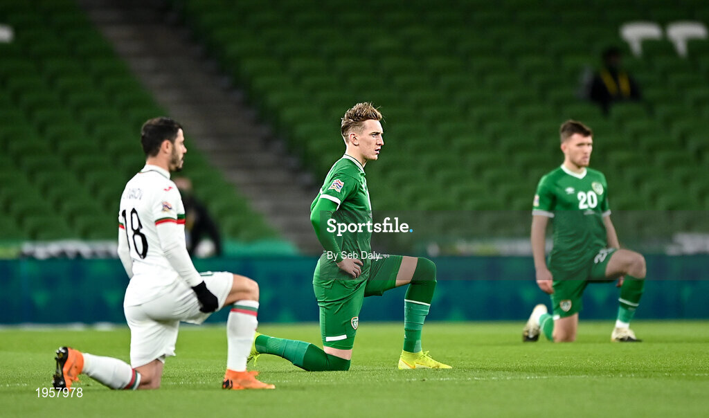 18 November 2020; Ronan Curtis of Republic of Ireland takes a knee in support of the Black Lives Matter movement prior to the start of the UEFA Nations League B match between Republic of Ireland and Bulgaria at the Aviva Stadium in Dublin. Photo by Seb Daly/Sportsfile