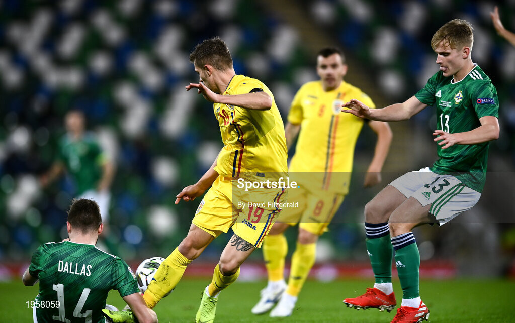 18 November 2020; Florin Tanase of Romania in action against Alistair McCann of Northern Ireland, right, and Stuart Dallas during the UEFA Nations League B match between Northern Ireland and Romania in the National Football Stadium at Windsor Park in Belfast. Photo by David Fitzgerald/Sportsfile