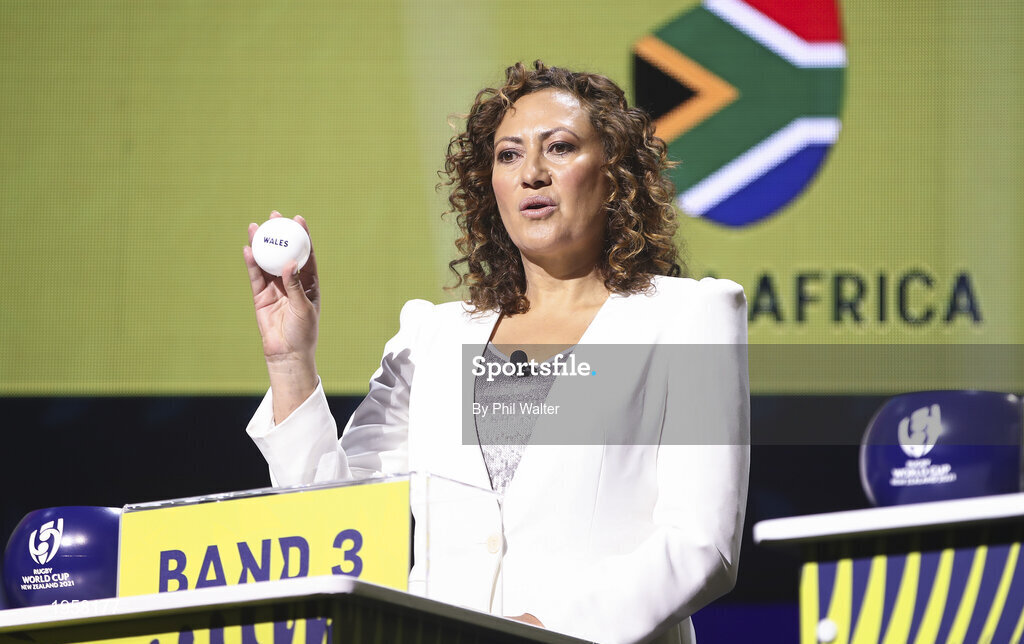20 November 2020; Former Black Fern and Rugby World Cup Board Member, Melodie Robinson, draws out the Wales team during the Rugby World Cup 2021 Draw event at the SKYCITY Theatre in Auckland, New Zealand. Photo by Phil Walter / World Rugby via Sportsfile