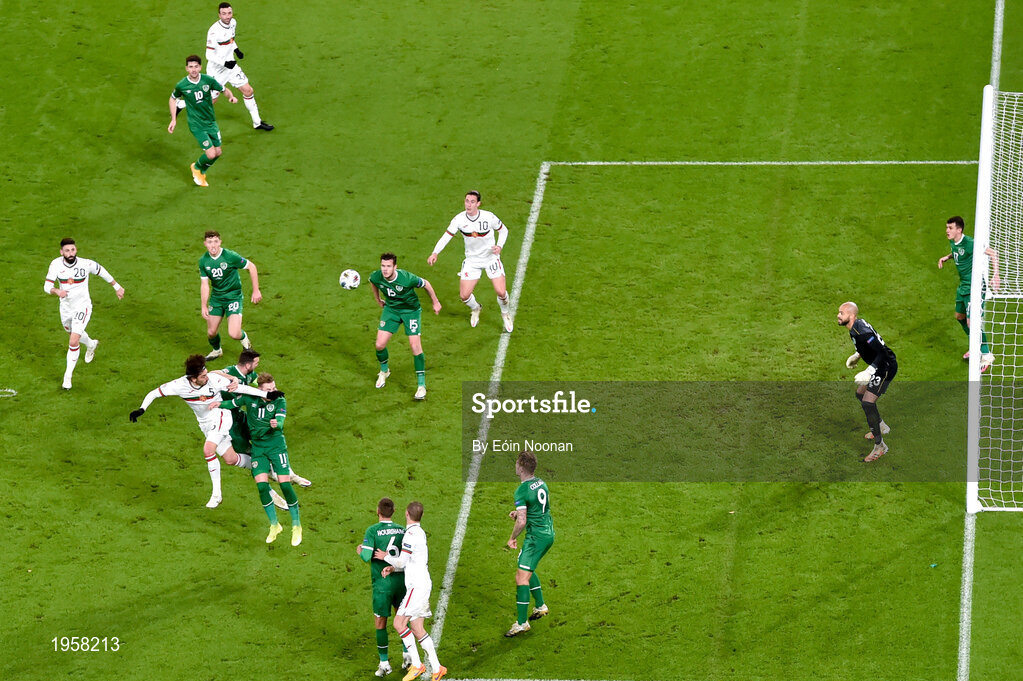 18 November 2020; Kristian Dimitrov of Bulgaria has a header go wide during the UEFA Nations League B match between Republic of Ireland and Bulgaria at the Aviva Stadium in Dublin. Photo by Eóin Noonan/Sportsfile