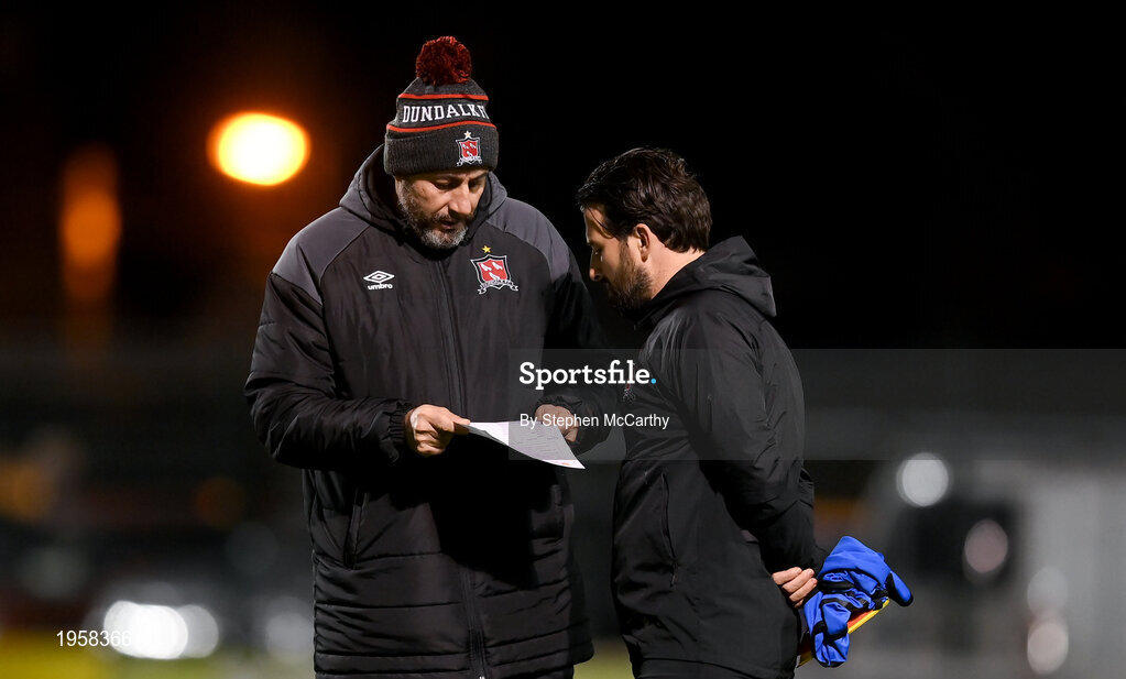 20 November 2020; Dundalk manager Filippo Giovagnoli, left, and assistant manager Giuseppe Rossi examine the teams prior to the Extra.ie FAI Cup Quarter-Final match between Bohemians and Dundalk at Dalymount Park in Dublin. Photo by Stephen McCarthy/Sportsfile
