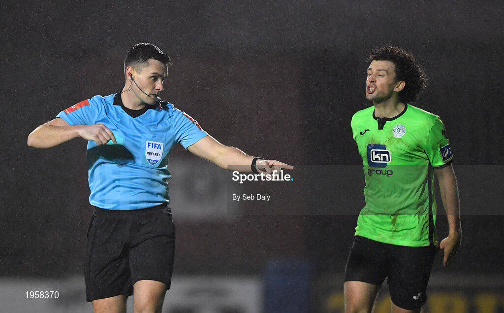 20 November 2020; Barry McNamee of Finn Harps reacts after referee Robert Hennessy awarded a second penalty against his side during the Extra.ie FAI Cup Quarter-Final match between Finn Harps and Shamrock Rovers at Finn Park in Ballybofey, Donegal. Photo by Seb Daly/Sportsfile
