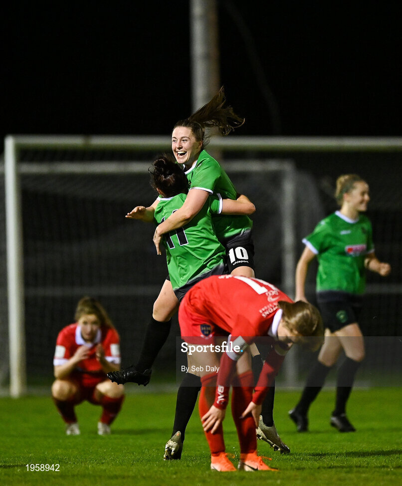 21 November 2020; Peamount United captain Áine O’Gorman and Eleanor Ryan-Doyle celebrate at the final whistle following their side's victory over Shelbourne in their Women's National League at PRL Park in Greenogue, Dublin. Photo by Seb Daly/Sportsfile