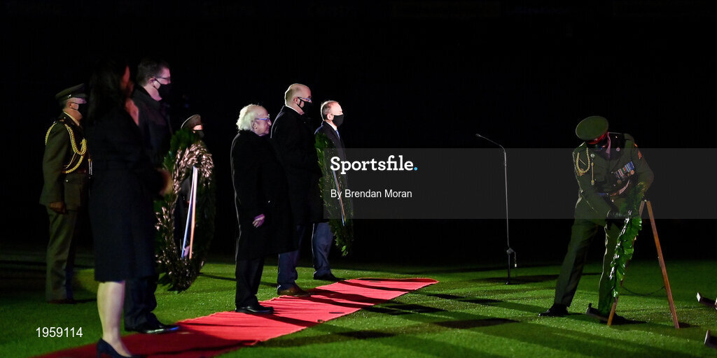 21 November 2020; Aide-De-Camp to President Michael D Higgins, Sgt Stephen Grennan, places a wreath on behalf of the people of Ireland in the memory of those who passed away, during the GAA Bloody Sunday Commemoration at Croke Park in Dublin. On this day 100 years ago, Sunday 21 November 1920, an attack by Crown Forces on the attendees at a challenge Gaelic Football match between Dublin and Tipperary during the Irish War of Independence resulted in 14 people being murdered. Along with the 13 supporters that lost their lives that day a Tipperary footballer, Michael Hogan, also died. The main stand in Croke Park, the Hogan Stand, was subsequently named after him. Photo by Brendan Moran/Sportsfile