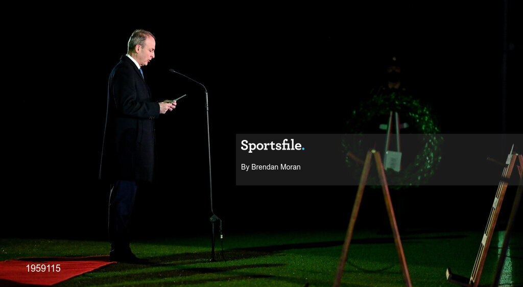 21 November 2020; An Taoiseach Micheál Martin TD spekaing during the GAA Bloody Sunday Commemoration at Croke Park in Dublin. On this day 100 years ago, Sunday 21 November 1920, an attack by Crown Forces on the attendees at a challenge Gaelic Football match between Dublin and Tipperary during the Irish War of Independence resulted in 14 people being murdered. Along with the 13 supporters that lost their lives that day a Tipperary footballer, Michael Hogan, also died. The main stand in Croke Park, the Hogan Stand, was subsequently named after him. Photo by Brendan Moran/Sportsfile