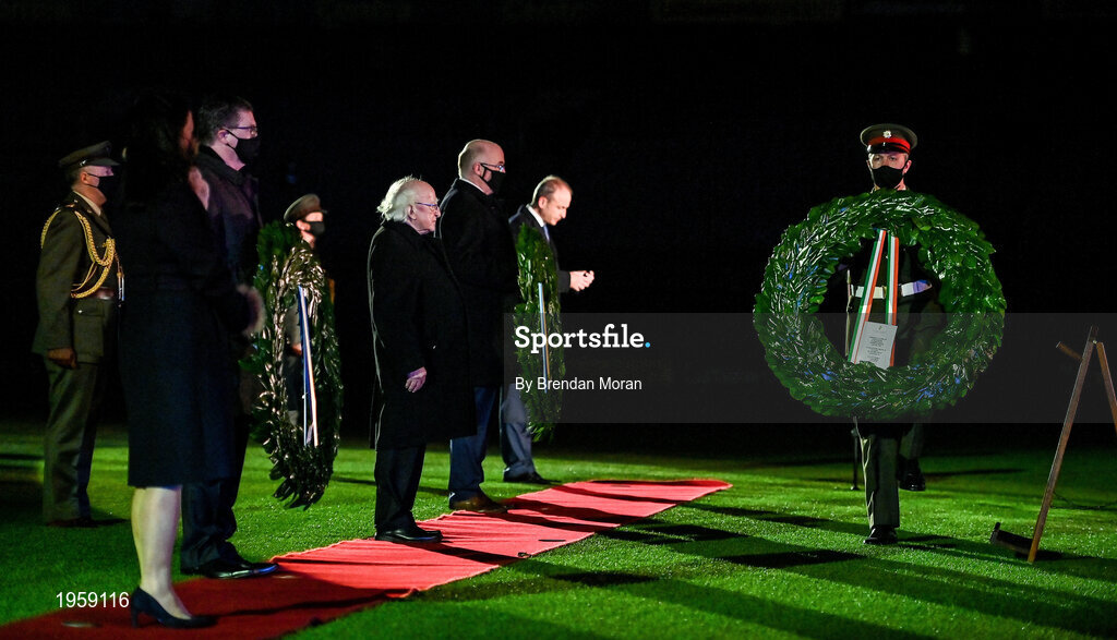 21 November 2020; Aide-De-Camp to President Michael D Higgins, Sgt Stephen Grennan, carries a wreath on behalf of the people of Ireland in the memory of those who passed away, during the GAA Bloody Sunday Commemoration at Croke Park in Dublin. On this day 100 years ago, Sunday 21 November 1920, an attack by Crown Forces on the attendees at a challenge Gaelic Football match between Dublin and Tipperary during the Irish War of Independence resulted in 14 people being murdered. Along with the 13 supporters that lost their lives that day a Tipperary footballer, Michael Hogan, also died. The main stand in Croke Park, the Hogan Stand, was subsequently named after him. Photo by Brendan Moran/Sportsfile