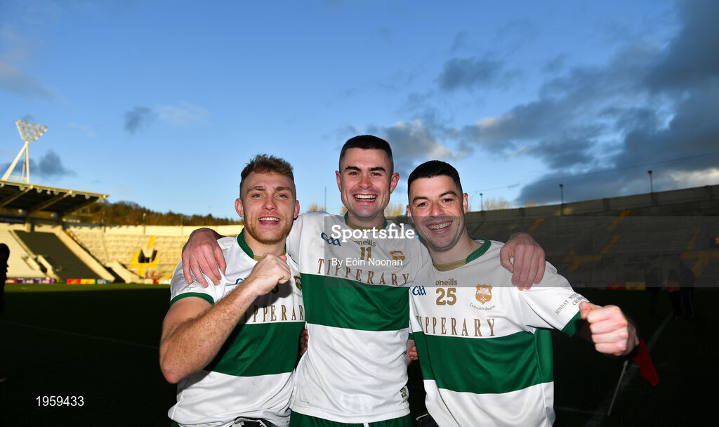 22 November 2020; Tipperary players, from left, Kevin Fahey, Michael Quinlivan and Shane Foley celebrate following the Munster GAA Football Senior Championship Final match between Cork and Tipperary at Páirc Uí Chaoimh in Cork. Photo by Eóin Noonan/Sportsfile