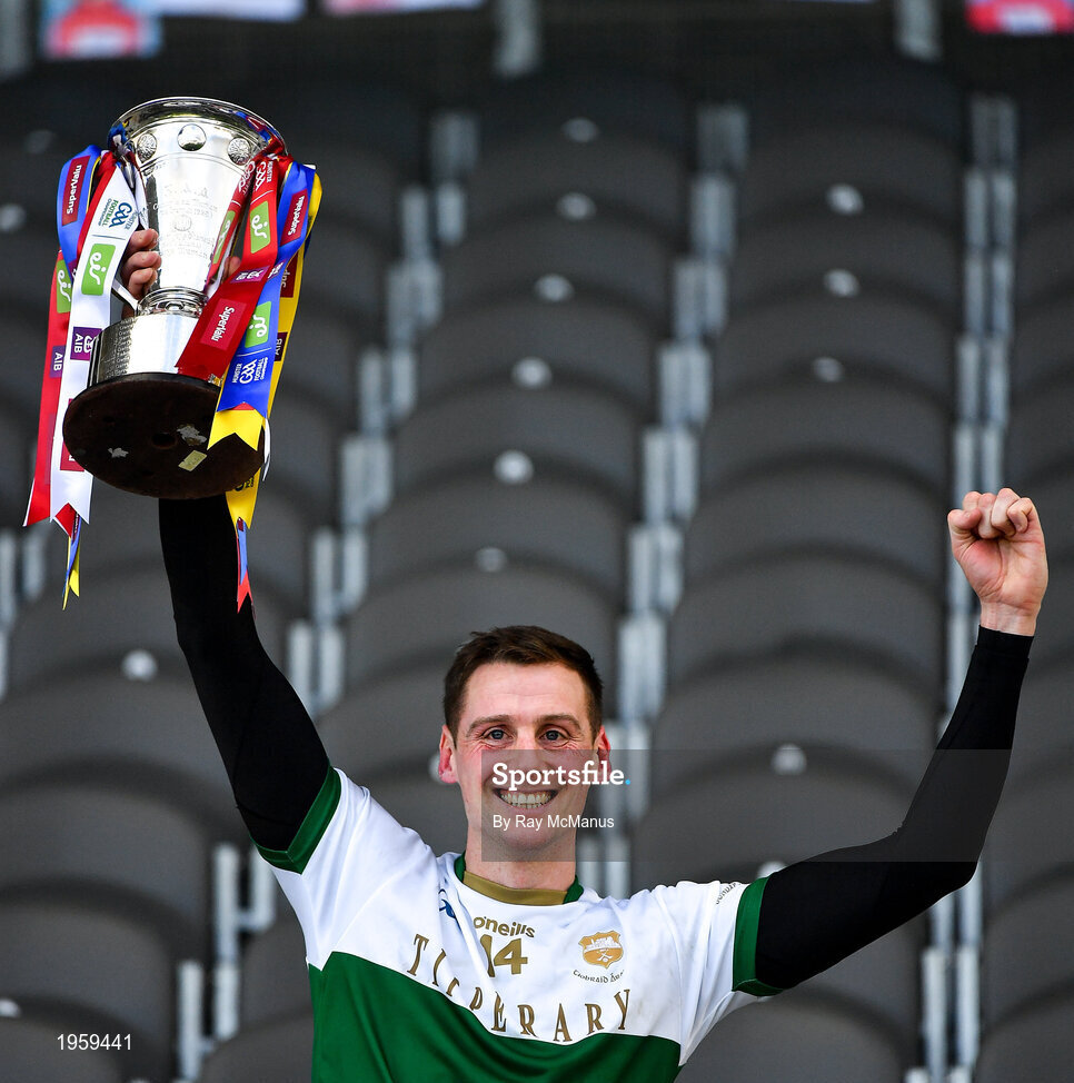 22 November 2020; Conor Sweeney, the Tipperary captain, lifts the cup after the Munster GAA Football Senior Championship Final match between Cork and Tipperary at Páirc Uí Chaoimh in Cork. Photo by Ray McManus/Sportsfile