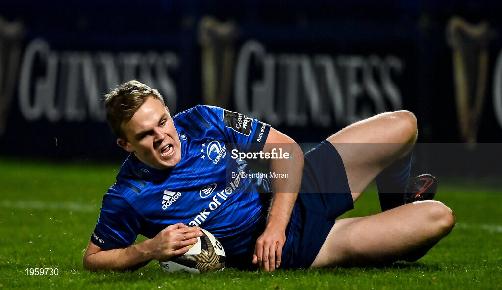 22 November 2020; Michael Silvester of Leinster scores a try during the Guinness PRO14 match between Leinster and Cardiff Blues at RDS Arena in Dublin. Photo by Brendan Moran/Sportsfile