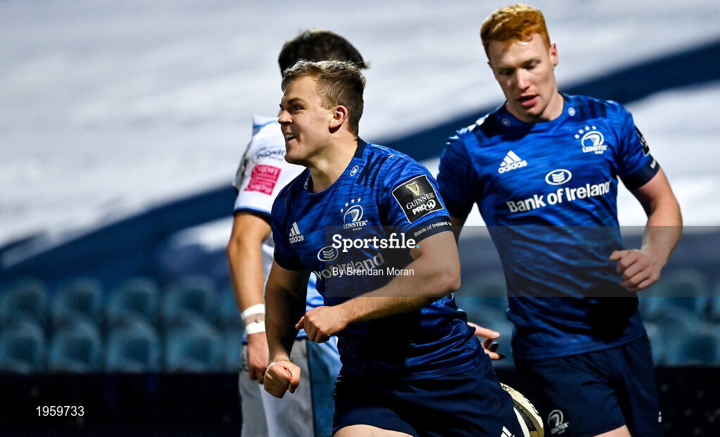 22 November 2020; Michael Silvester of Leinster celebrates after scoring a try during the Guinness PRO14 match between Leinster and Cardiff Blues at RDS Arena in Dublin. Photo by Brendan Moran/Sportsfile