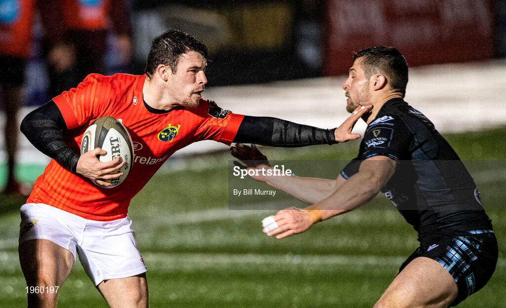 23 November 2020; Calvin Nash of Munster is tackled by Robbie Fergusson of Glasgow Warriors during the Guinness PRO14 match between Glasgow Warriors and Munster at Scotstoun Stadium in Glasgow, Scotland. Photo by Bill Murray/Sportsfile