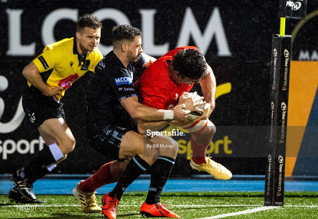 23 November 2020; Jean Kleyn of Munster dives to scores his side's fourth try during the Guinness PRO14 match between Glasgow Warriors and Munster at Scotstoun Stadium in Glasgow, Scotland. Photo by Bill Murray/Sportsfile