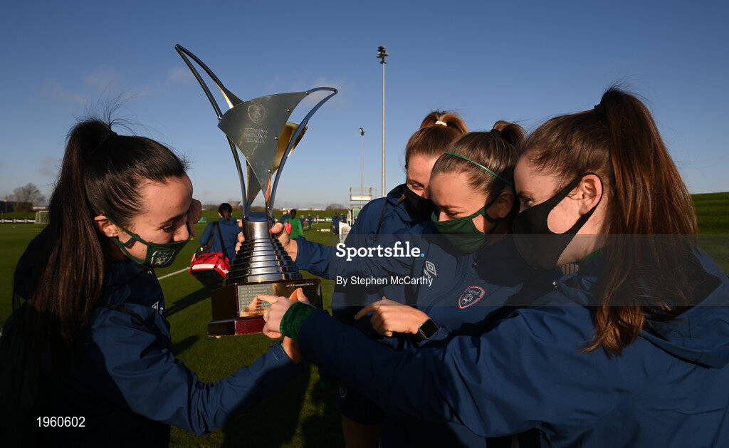 25 November 2020; Players, from left, Niamh Farrelly, Claire Walsh, Katie McCabe and Niamh Reid-Burke examine the previous winners of the Women's National League on the trophy during a Republic of Ireland Women training session at the FAI National Training Centre in Abbotstown, Dublin. Photo by Stephen McCarthy/Sportsfile