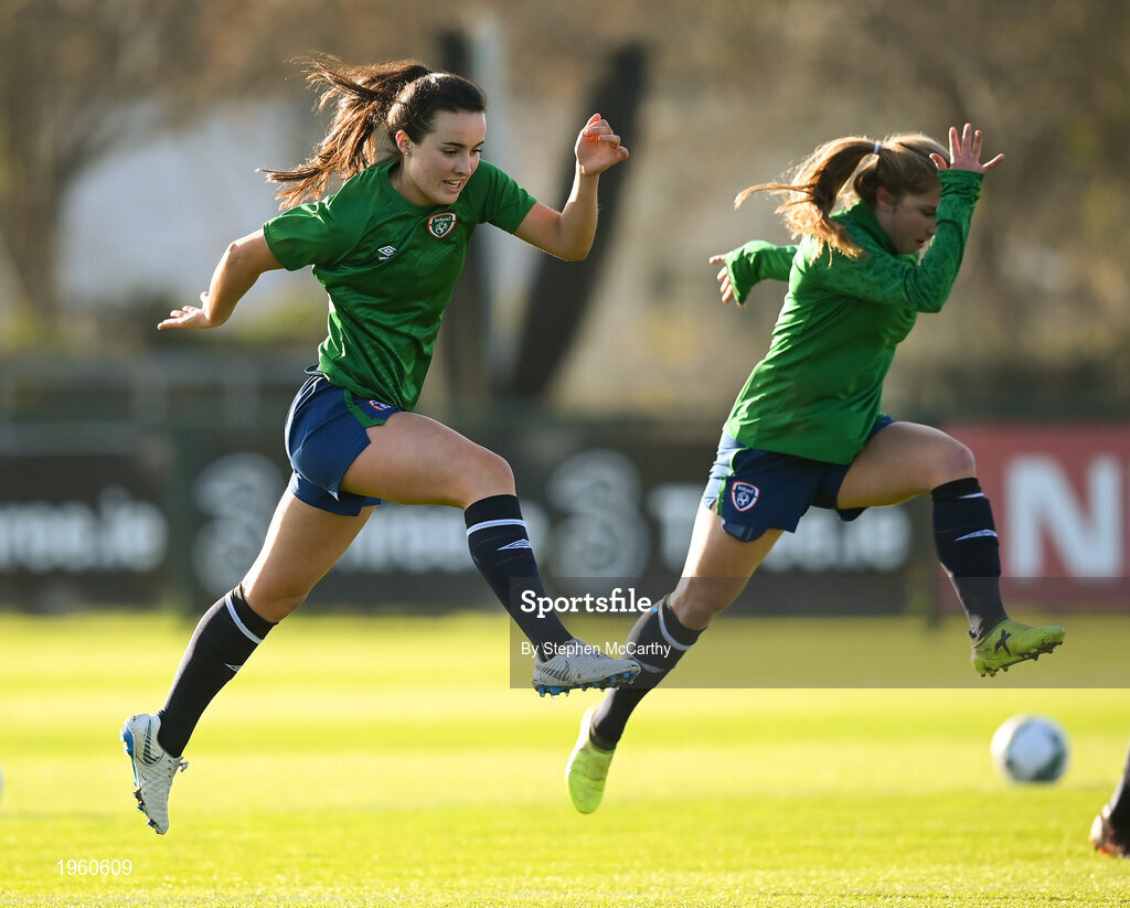 25 November 2020; Niamh Farrelly, left, and Ellen Molloy during a Republic of Ireland Women training session at the FAI National Training Centre in Abbotstown, Dublin. Photo by Stephen McCarthy/Sportsfile