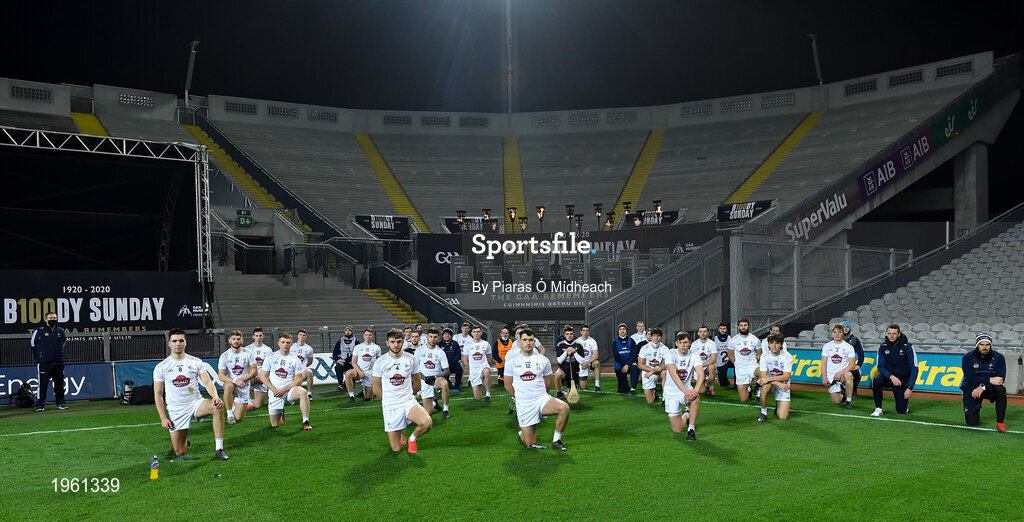 22 November 2020; Kildare players pose for a socially distanced photograph in front Hill 16 after the Christy Ring Cup Final match between Down and Kildare at Croke Park in Dublin. Photo by Piaras Ó Mídheach/Sportsfile