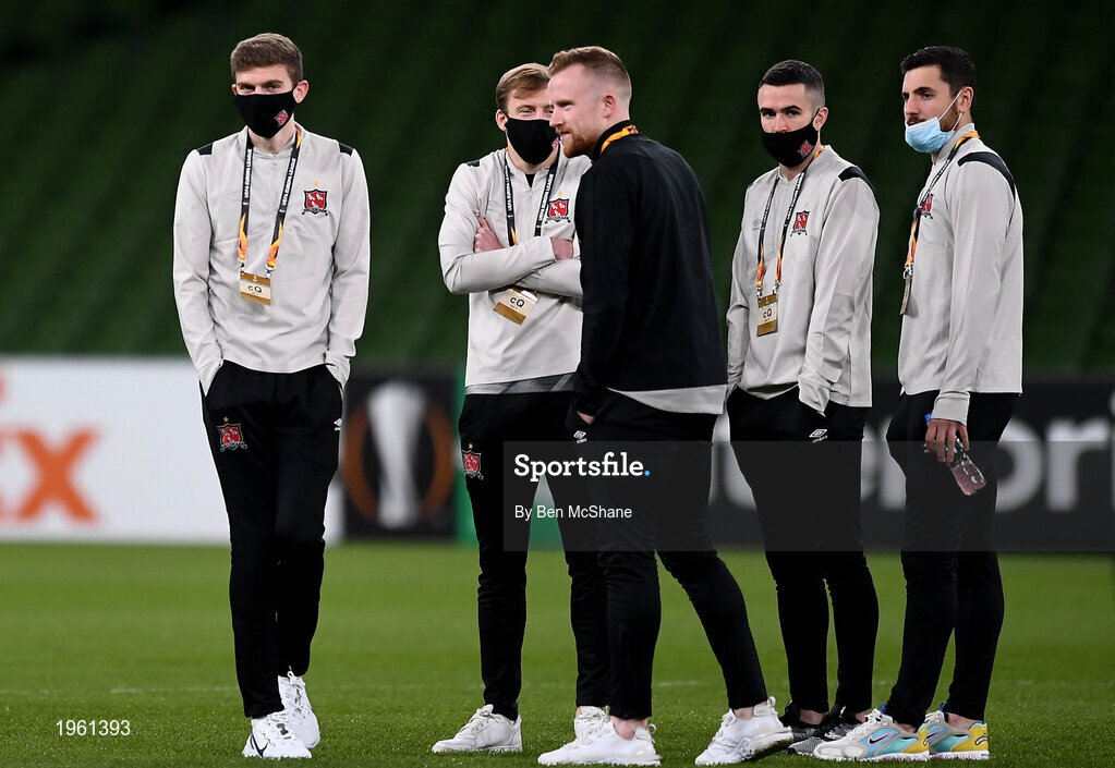 26 November 2020; Dundalk players, from left, Sean Gannon, David McMillan, Sean Hoare, Michael Duffy and Jordan Flores ahead of the UEFA Europa League Group B match between Dundalk and SK Rapid Wien at Aviva Stadium in Dublin. Photo by Ben McShane/Sportsfile